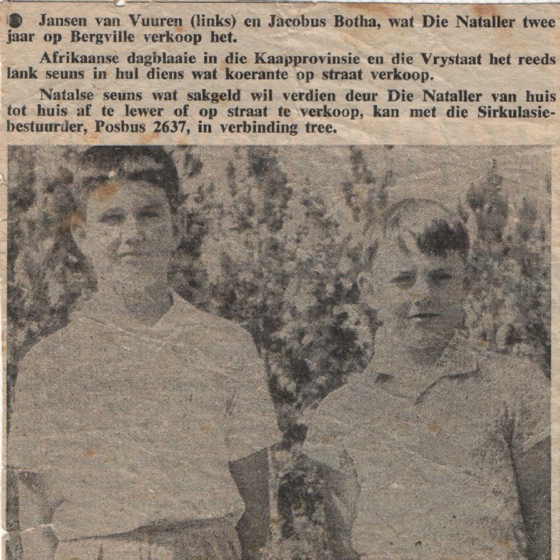 'n Koerant met Jansen Van Vuuren en Kobus Botha in 'n foto vir hulle koerantaflewerings-dienste Bergville. |