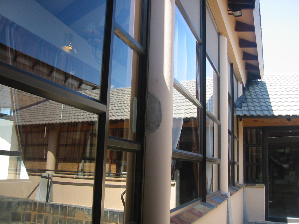 Die weerlig het kwaai skade gedoen en al die rekenaars uitgeslaan. Daar teen die pilaar is die pleister afgeslaan. |